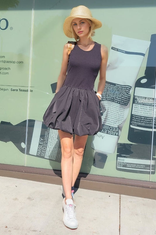 MIMI BUBBLE TANK DRESS (GREY RIB / BLACK LINEN) - VD3328
