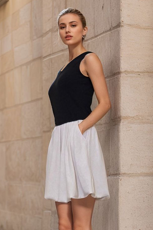 MIMI BUBBLE TANK DRESS (BLACK RIB / NATURAL TAUPE LINEN)- VD3328
