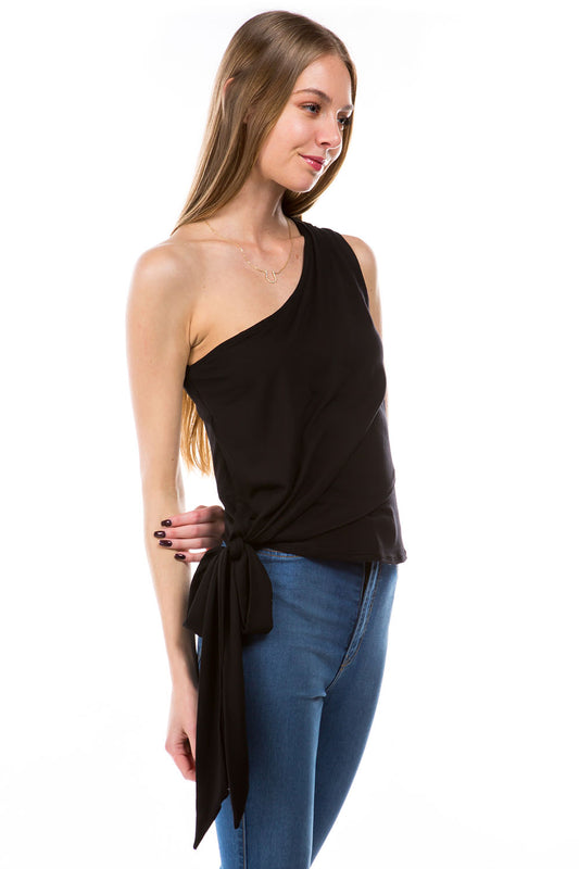ANAIS ASYMMETRICAL WAIST RIBBON TIE TOP (BLACK)- VT2917