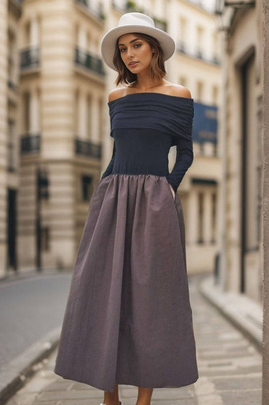 BETTY OFF SHOULDER MIDI DRESS (BLACK / BROWN)- VD3374