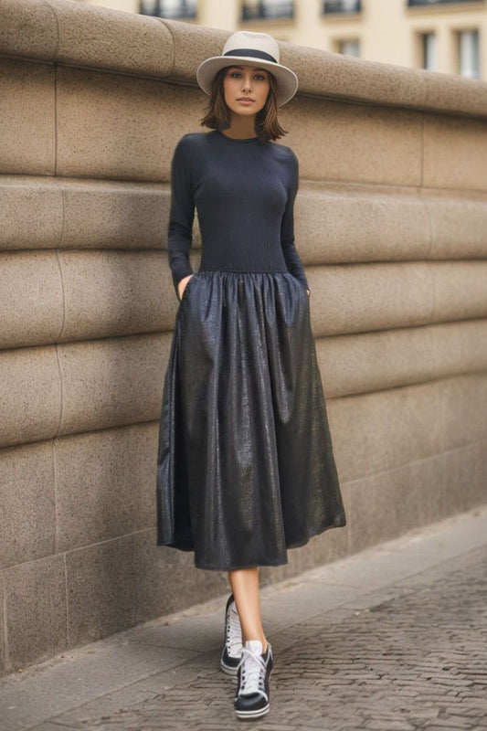BETTY ROUND NECK LONG SLEEVE BUBBLE DRESS (BLACK / BLACK FLEATHER) - VD3376