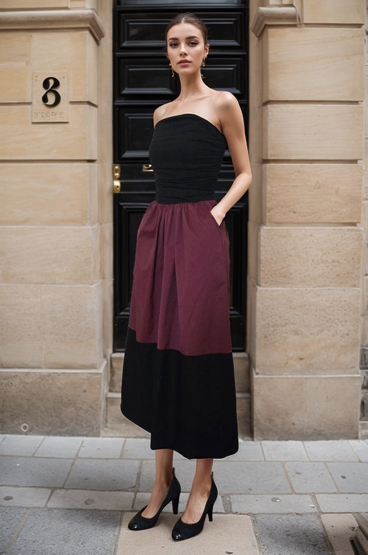 BRITTNEY COLOR BLOCK TUBE MID DRESS(BLK/WINE/BLK)-VD3434