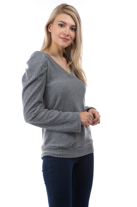 BRIDGET PUFF SLEEVE V NECK TOP (BRUSH GREY)-VT2857