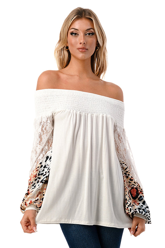 CHEVRON OFF SHOULDER TOP (IVORY / WHITE LEOPARD)- VT2646