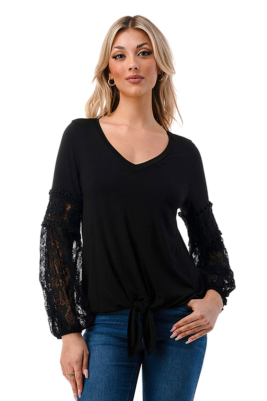 CLAIRE V NECK FRONT TIE TOP (BLACK/ BLACK LACE)-VT3044