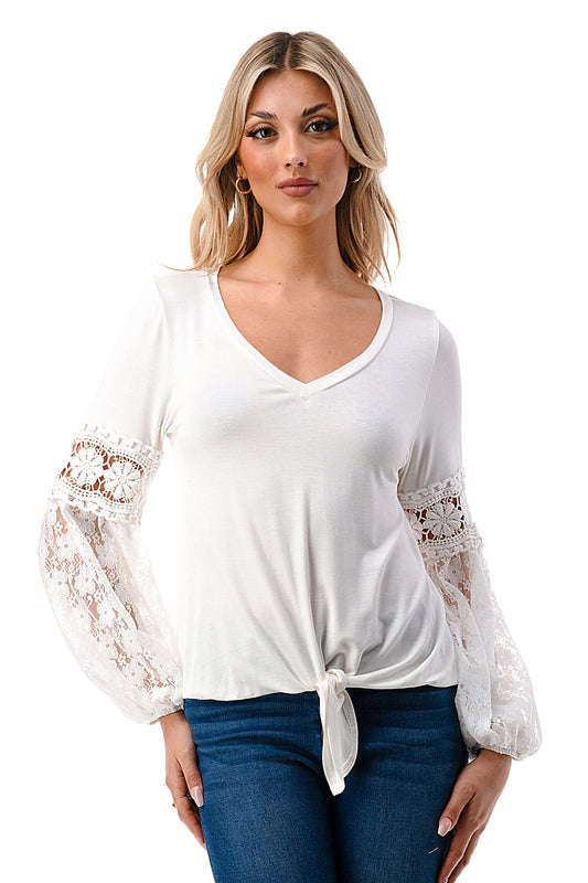 CLAIRE V NECK FRONT TIE TOP (IVORY/ IVORY LACE)-VT3044