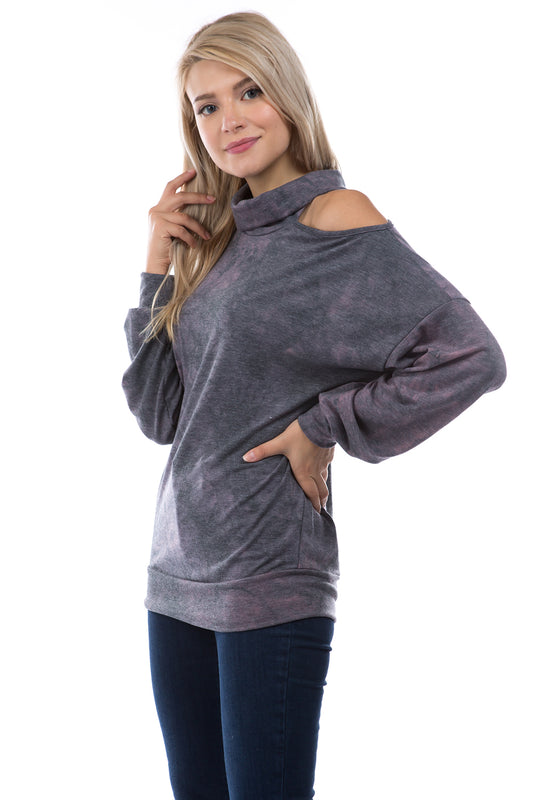 ELISE OPEN SHOULDER TURTLE NECK TOP (FRENCH TERRY GREY/PINK TIE DYE)-VT2842