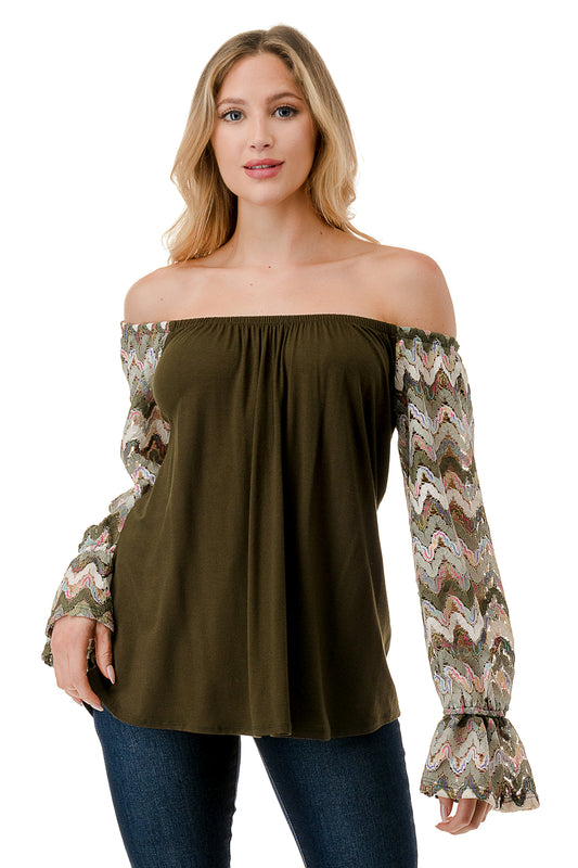 FRANCES OFF SHOULDER TOP (OLIVE / OLIVE MULTI WAVE)- VT3160