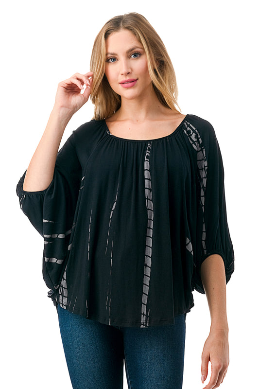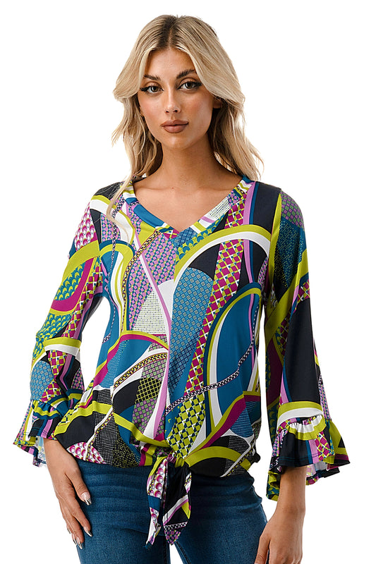 IVY FRONT TIE V NECK TOP (BLACK PURPLE GEO)-VT3018LA