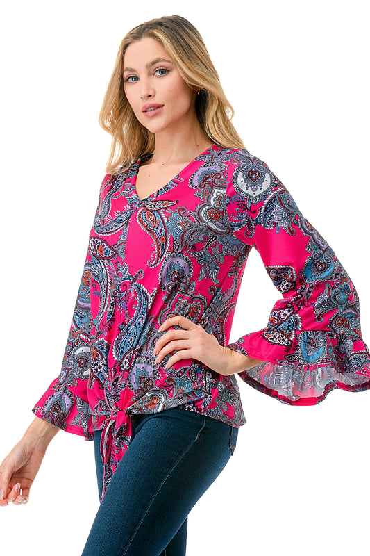 IVY FRONT TIE V NECK TOP (HOT PINK PAISLEY)-VT3018LA
