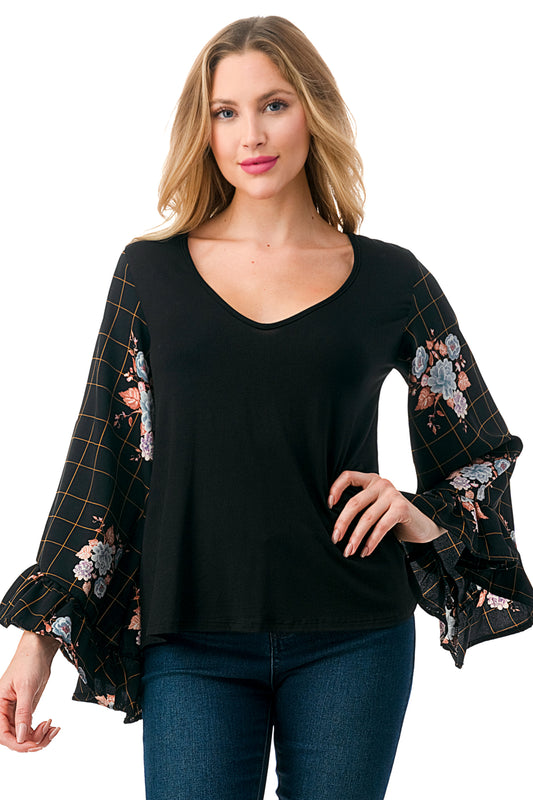 JANE V NECK RUFFLE SLEEVE TOP (BLACK / FLORAL PLAID)- VT3171-NO TIE