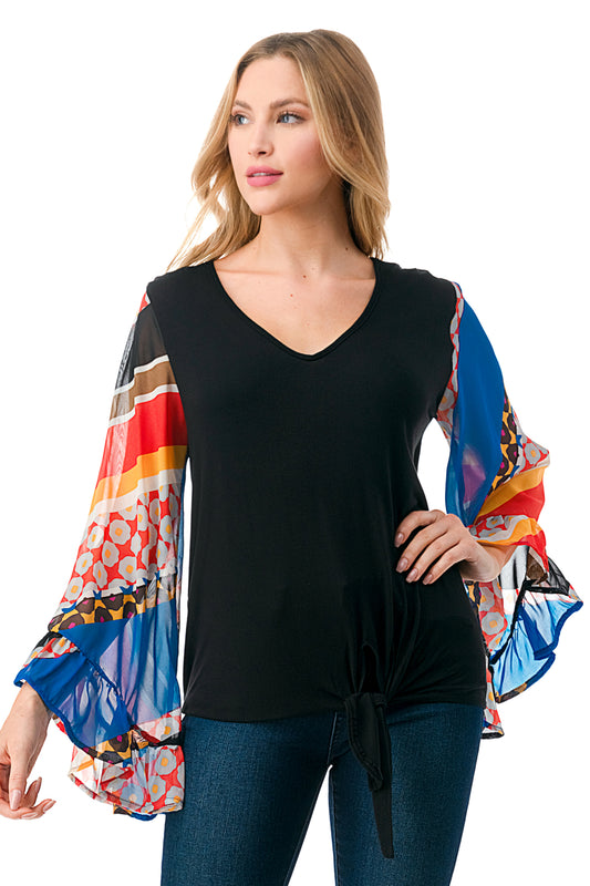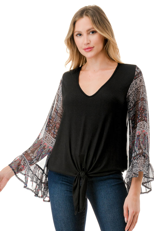JANE V NECK RUFFLE SLEEVE TOP (BLACK / VINTAGE BOHO)- VT3171