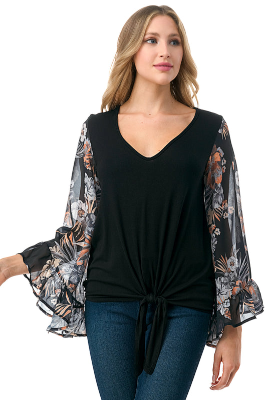 JANE V NECK RUFFLE SLEEVE TOP (BLACK/BLACK FLORAL)- VT3171