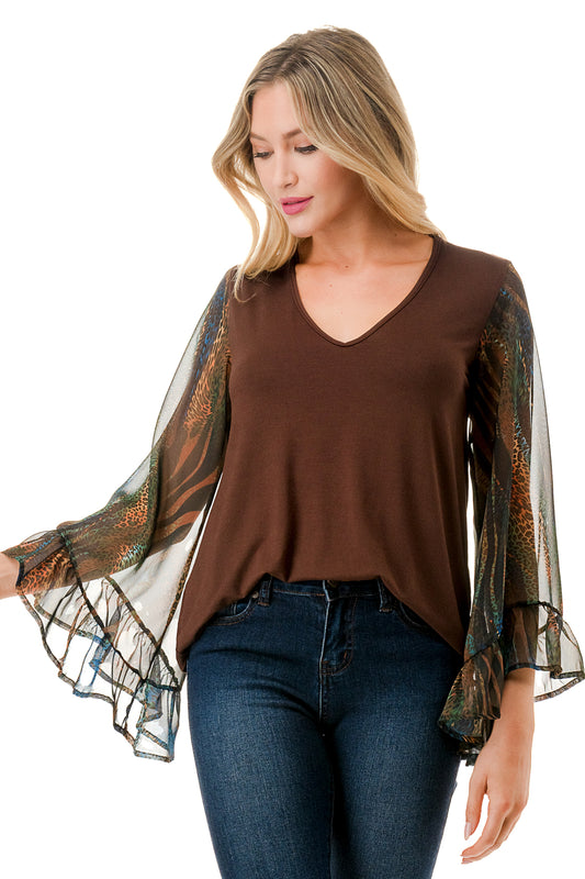 JANE V NECK RUFFLE SLEEVE TOP (DARK BROWN / FALL ZEBRA)- VT3171-NO TIE