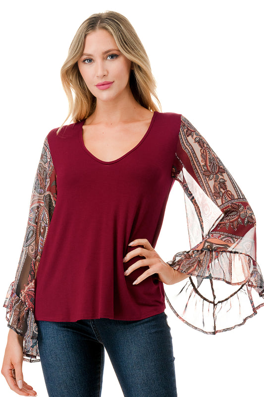 JANE V NECK RUFFLE SLEEVE TOP (DARK WINE/FALL IN LOVE)- VT3171-NO TIE