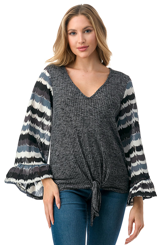 JANE V NECK RUFFLE SLEEVE TOP (GREY HACCI / GREY WAVE)- VT3171