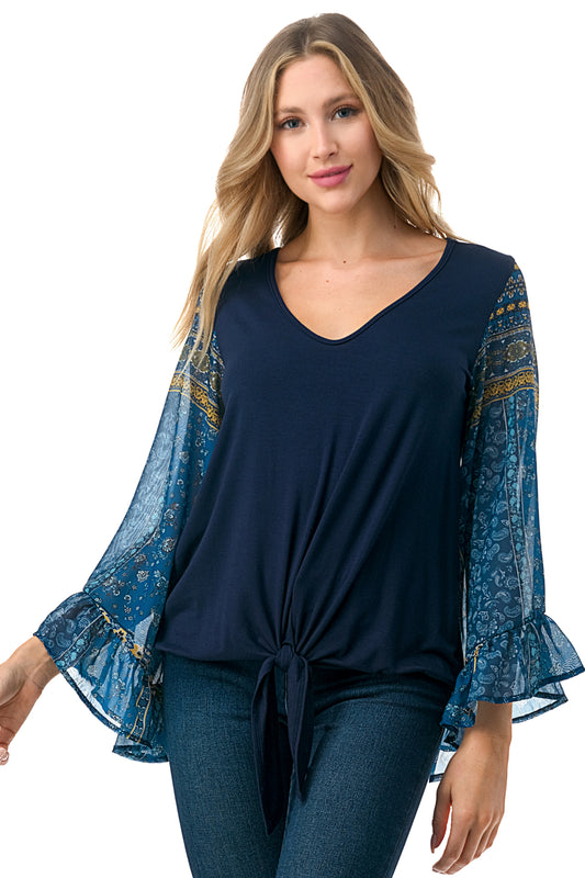 JANE V NECK RUFFLE SLEEVE TOP (NAVY/TEAL BOHO)- VT3171