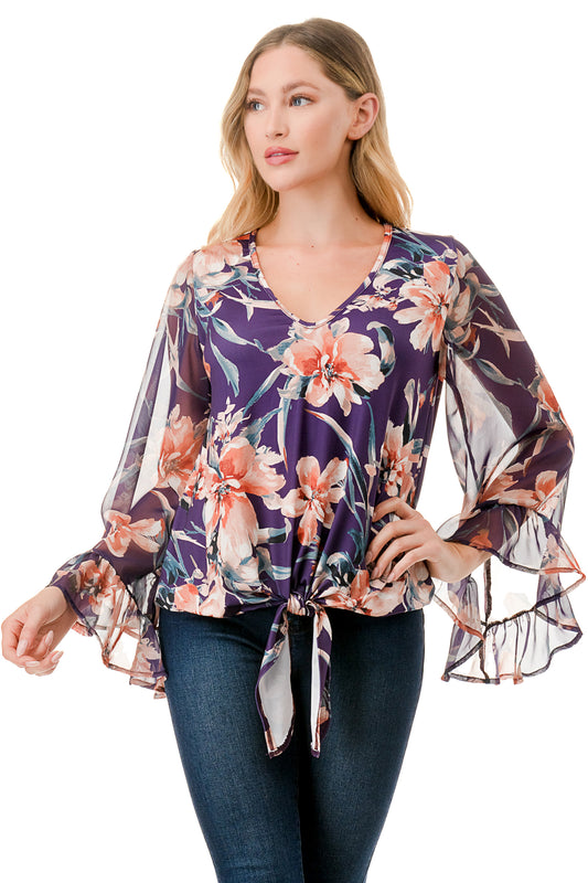 JANE V NECK RUFFLE SLEEVE TOP (PURPLE FLORAL / PURPLE FLORAL CHIFFON)- VT3171