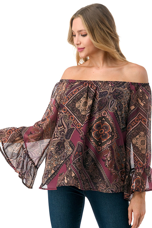 JANE OFF SHOULDER RUFFLE SLEEVE TOP (ROSE BOHO)- VT3172