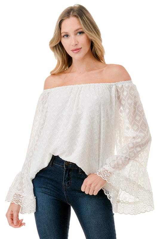 JANE OFF SHOULDER RUFFLE SLEEVE TOP (WHITE / WHITE LACE)- VT3172