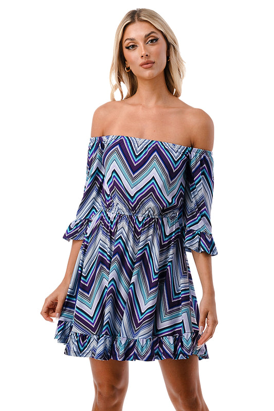 ANNA OFF SHOULDER DRESS (BLUE CHEVRON)- VD3124