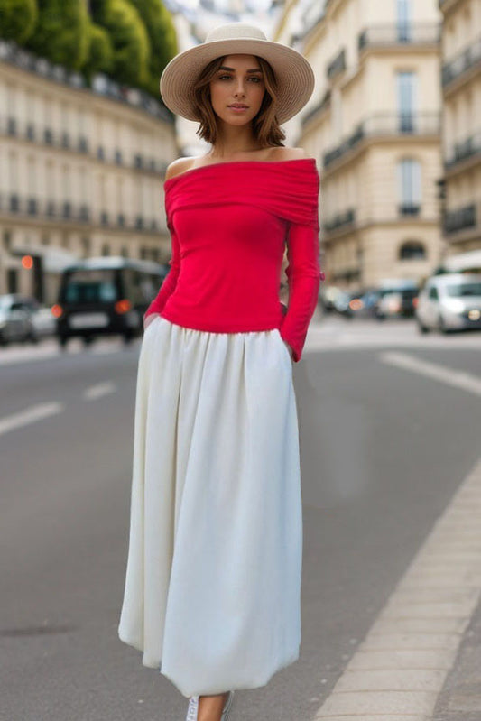 BETTY OFF SHOULDER MIDI BUBBLE DRESS (RED / CREAM) -VD3370