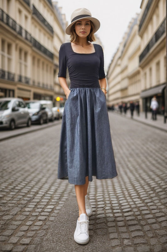 BETTY HALF SLEEVE MIDI DRESS (BLACK / DENIM) - VD3372