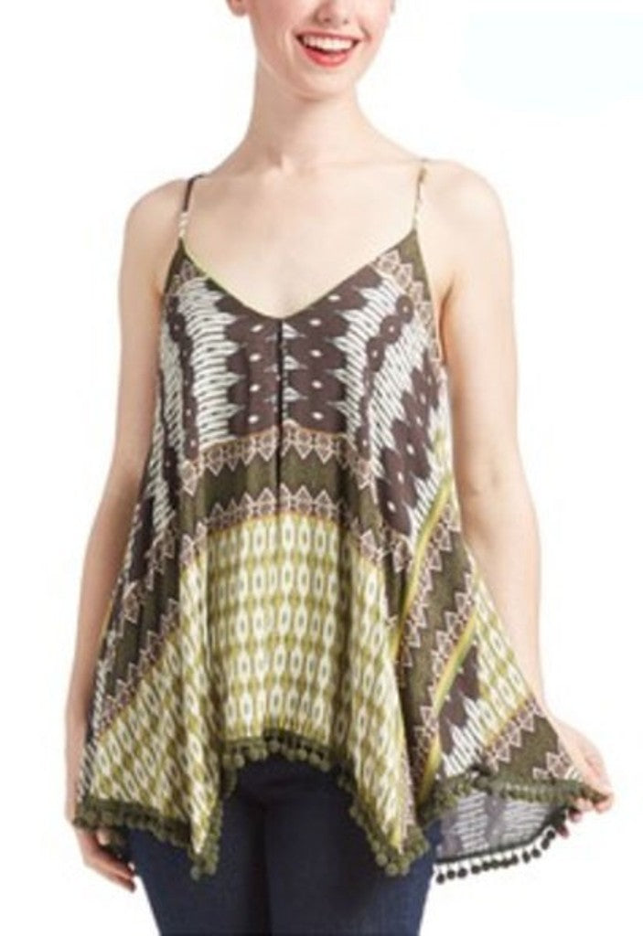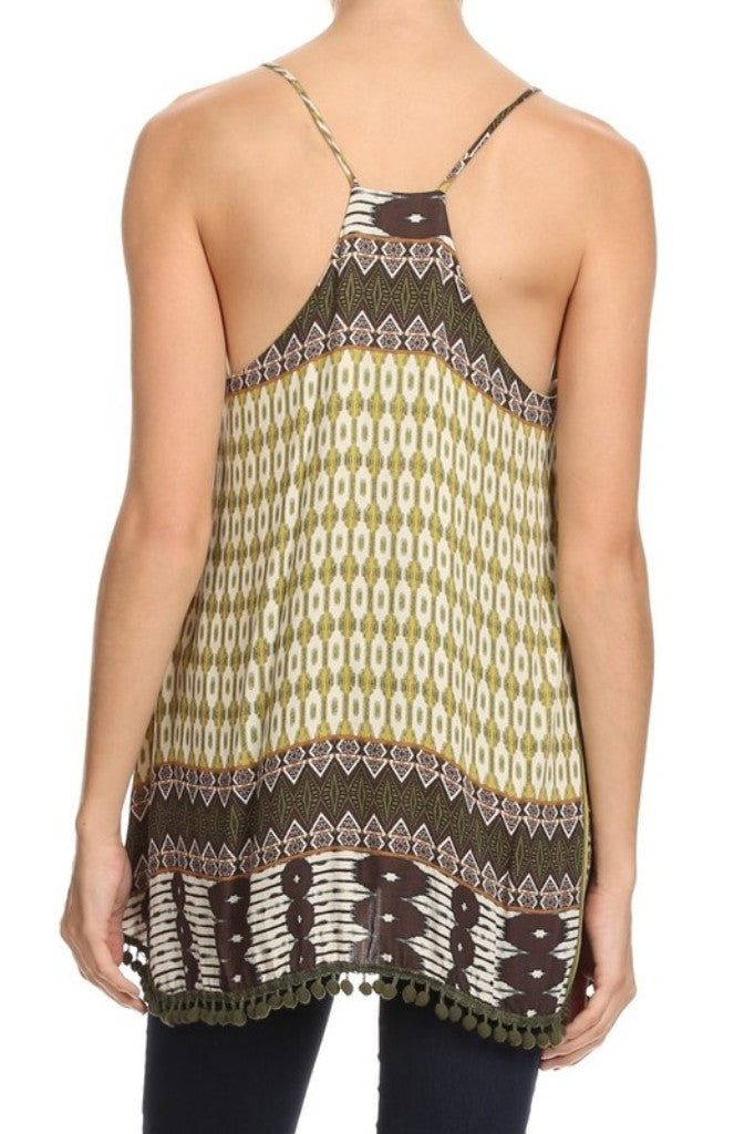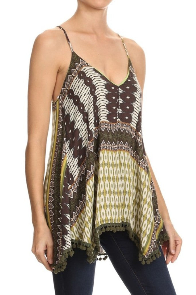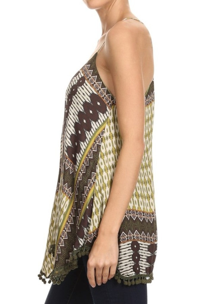 - Multi fabric, waist length sleeveless top in a relaxed style with a racerback and an asymmetric hem