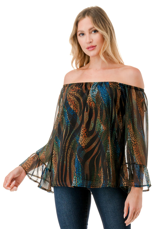 JANE OFF SHOULDER RUFFLE SLEEVE TOP (FALL ZEBRA)- VT3172