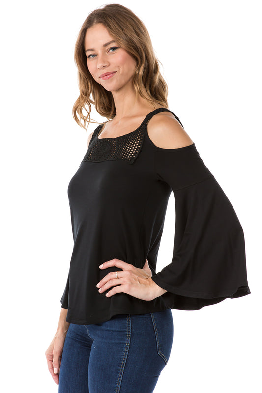 LACY 2 BELL SLEEVE CROCHET TOP (BLACK)- VT2562