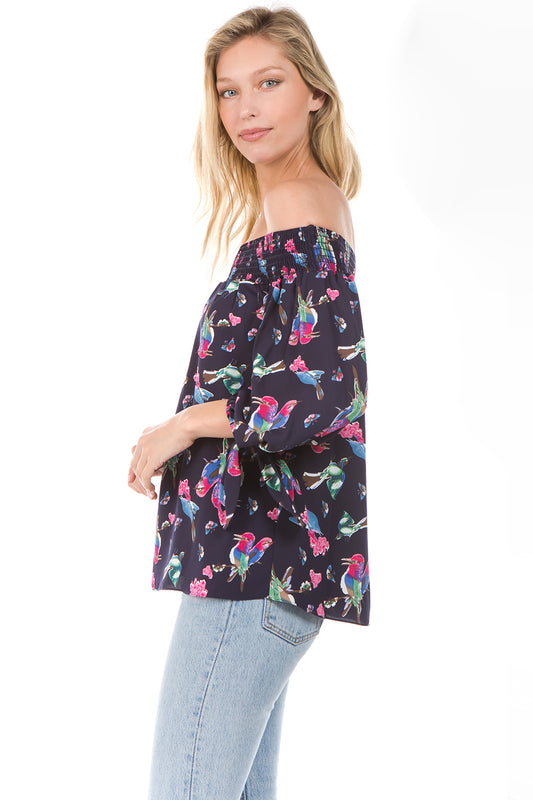 PRINTED OFF SHOULDER TOP (Navy Bird)- VT1071P