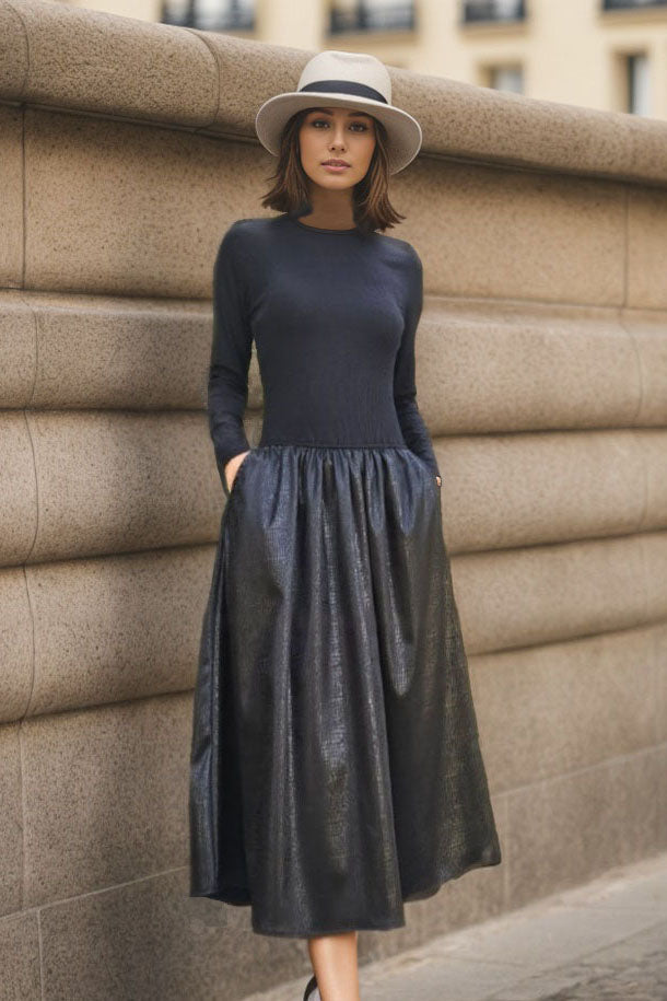 - ROUND NECK LONG SLEEVE MIDI DRESS