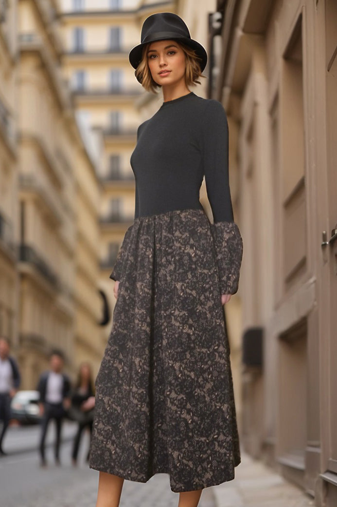 VICKY LONG BELL SLEEVE MIDI DRESS (BLACK RIB / BLACK CAMEL LACE)-VD3394
